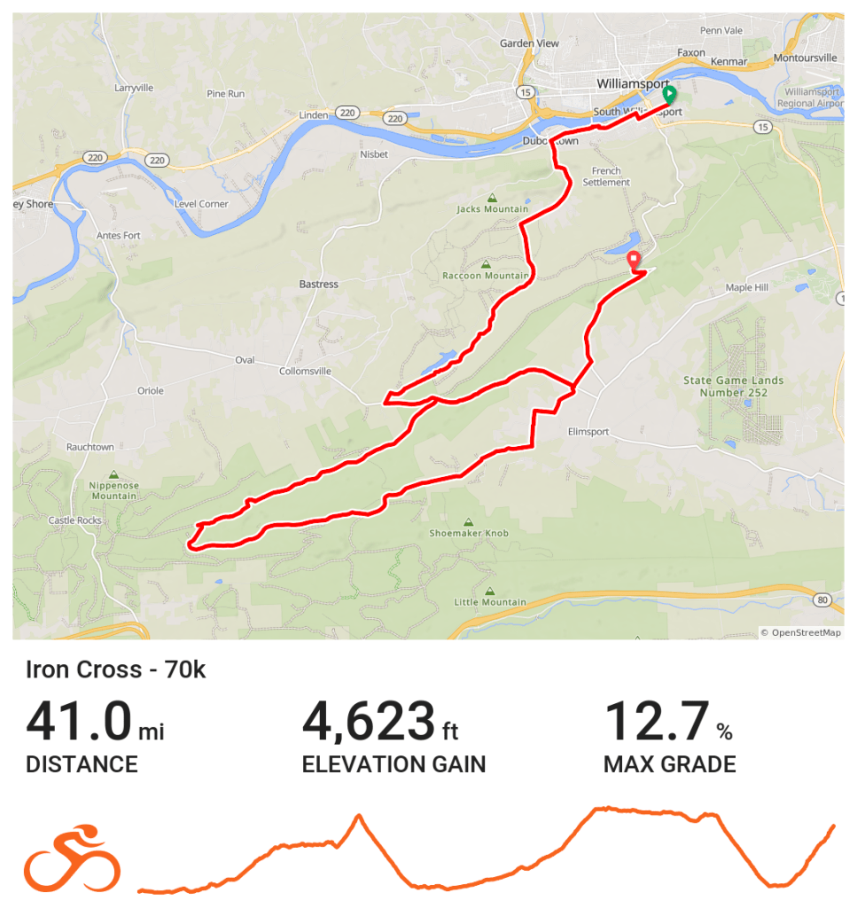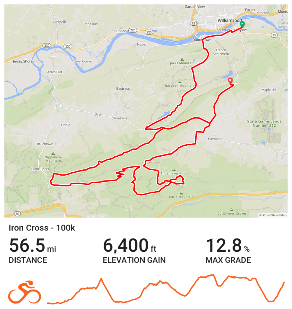 Our 30K* provides the most approachable version of Iron Cross while still providing the full experience. An initial climb through the Williamsport Municipal Water Authority checks the double track box. A ripping road descente down 44 provides some high speed action. Bower Road supplies the scenic farm road. The final climb provides what we consider the best mountaintop finish in Pennsylvania.